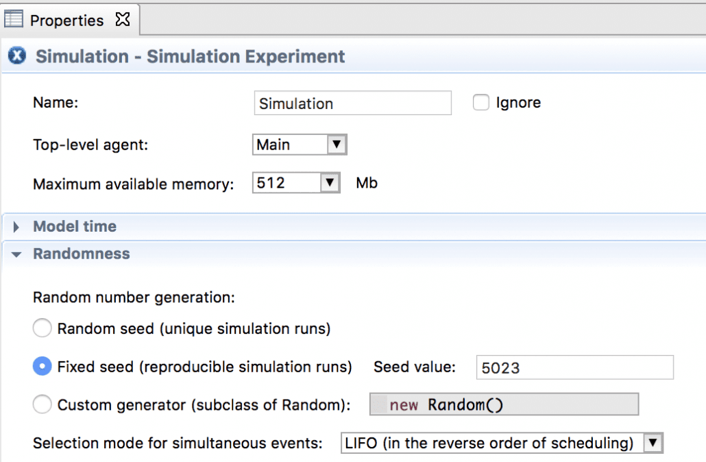 ”Show” If you found out the problem, well congratulations. But even if you did, there is still some value you can get from here. It is very common when we run our models to keep the seed fixed, which is great to find problems in your models, but it’s also great to hide the problems. In the model you downloaded, the seed value is set to 5023 (figure 4). Figure 4 – Fixed seed simulation The problem is here: MyAgent lastContactedAgent = randomWhere( main.myAgents, a-> !a.equals(this) ); if(lastContactedAgent.infected) latentInfection=true; The randomWhere function will return null if there is nothing found that fulfills the condition. The first agent that is created, will return null with the randomWhere function, because at that point, it is the only agent in the population. So lastContactedAgent.infected will throw an error. Since this function is executed only if the agent is not infected, the seed value will hide this problem because it will always have a first agent that is infected and hence doesn’t execute that function. It is important in this case to wait for all the agents to be created before checking if this agent should go to latent or not. A fixed seed, if you are unlucky, will never throw this error and you can end up building a giant model having these little mistakes. And when it’s time to do a monte carlo simulation or something of the sort, BOOM! Errors everywhere. Tip #1: Build your simulations using random seed. Use fixed seed only for testing and debugging. Now we understand that we need to create all the agents before checking if the agent should go to latent. To do that, we can create an auxiliary state and change the code to check from latent from the entry point to the exit action of our auxiliary state. The timeout of the auxiliary state can be 1 millisecond or less. We only need a minimal delay to ensure that all the agents are created before checking if the agent should go to latent state or not. Figure 4 – Final Model Download the model clicking here. Tip #2: Auxiliary states can be very helpful in the initialization of agents. I also use dynamic events with very short timeouts to ensure that things are happening after everything else was calculated. ”Hide”What was the problem?