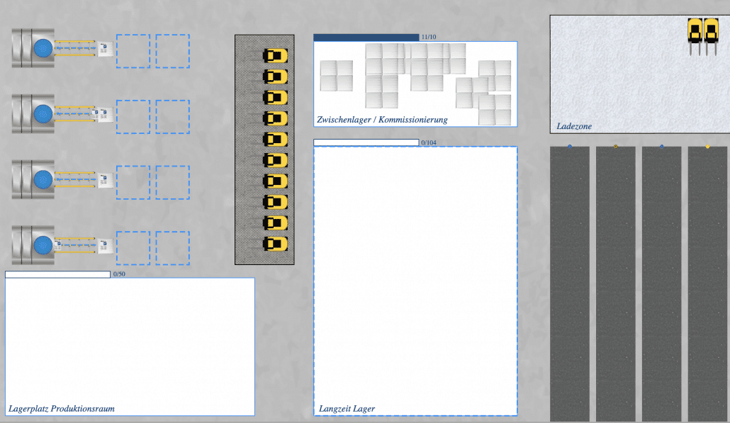 The aim was to illustrate the time schedule from the collection of manufactured products from a machine to the loading of the products for delivery. The following questions, were clarified in the simulation: